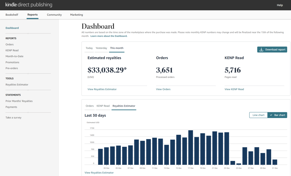 Made $33,038.29 in a month from Amazon Kindle Direct Publishing in December 2025!